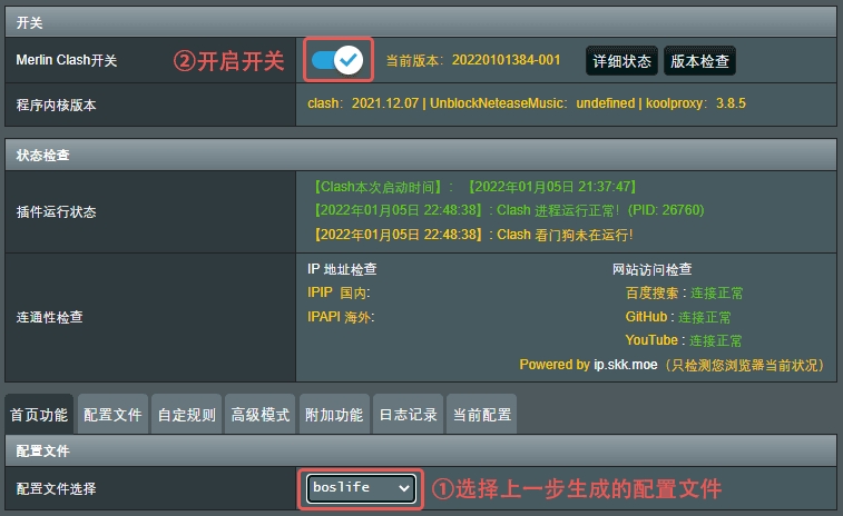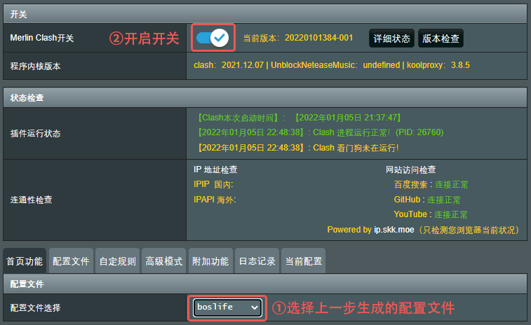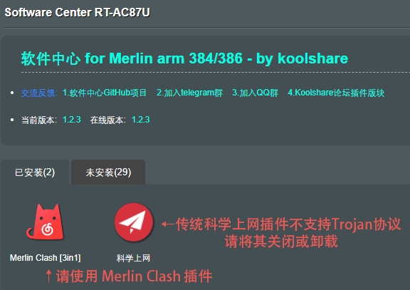 1、Merlin Clash 和 科学网 插件不能同时启用,请确保配置和启动 Merlin Clash 插件前彻底关闭或卸载原有的 科学上网 插件。