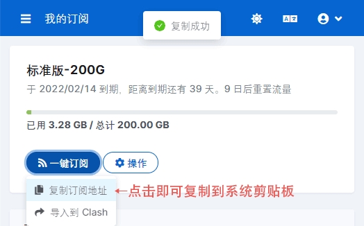 2、登录进入BosLife新站点的仪表盘或我的订阅页面,点击“一键订阅”按钮并选择“复制订阅地址”(点击后页面顶部会出现复制成功的标签提示)