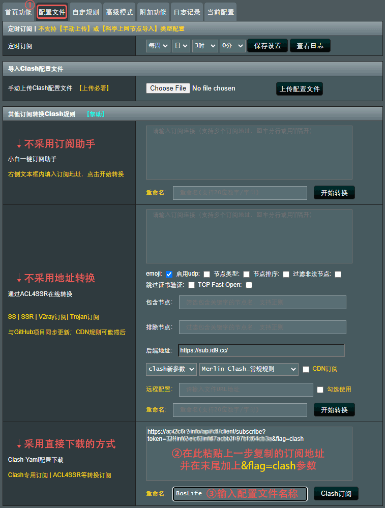 在右方文本框粘贴上一步复制的订阅地址,并在地址末尾加上&flag=clash参数。在下方的重命名处填入配置文件名称(例如BosLife),然后点击右方Clash订阅按钮即可开始订阅。